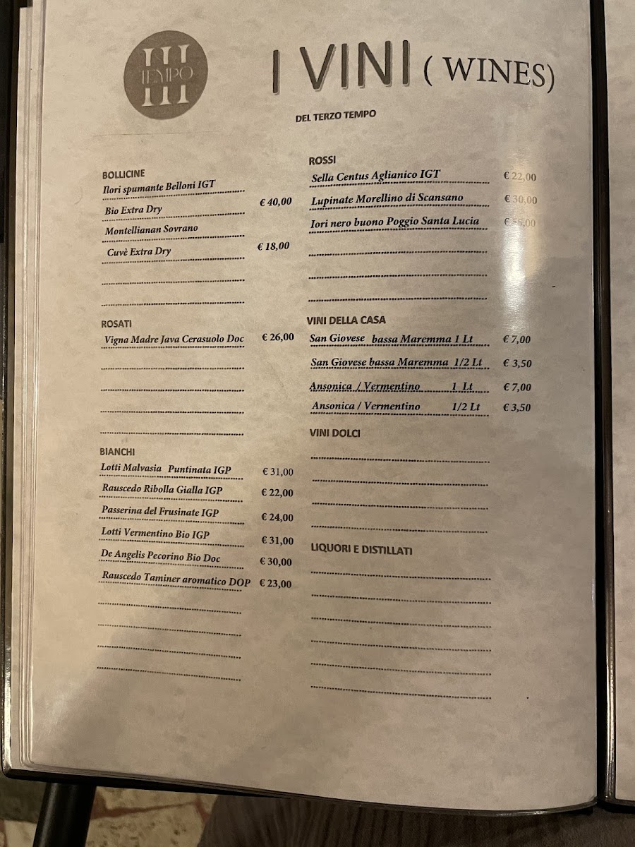 Desserts at Terzo Tempo, especially the homemade tiramisù and cantucci biscuits, bring a comforting finish, while the wine selection—red, white, and rosé offered by the glass—perfectly complements the meal.